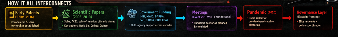 This comprehensive and detailed diagram/network map lets you see who did all the research, patents connected to vaccine/platforms, meetings, which agencies funded each phase, and governance nodes interlinked visually by date and role.