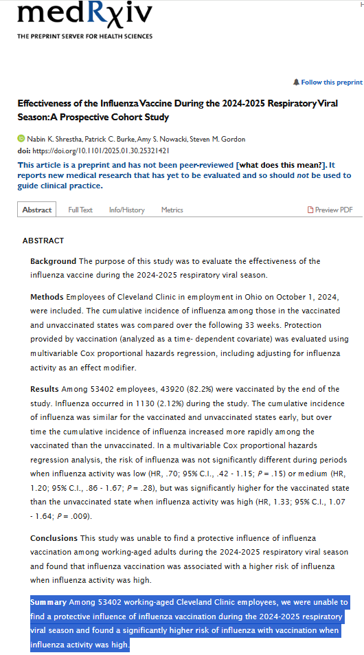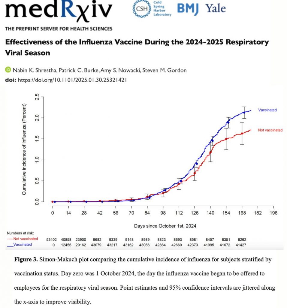 Not only does it not work, it actually causes people to get the flu. “Among 53402 working-aged Cleveland Clinic employees, we were unable to find a protective influence of influenza vaccination during the 2024-2025 respiratory viral season and found a significantly higher risk of influenza with vaccination when influenza activity was high.”