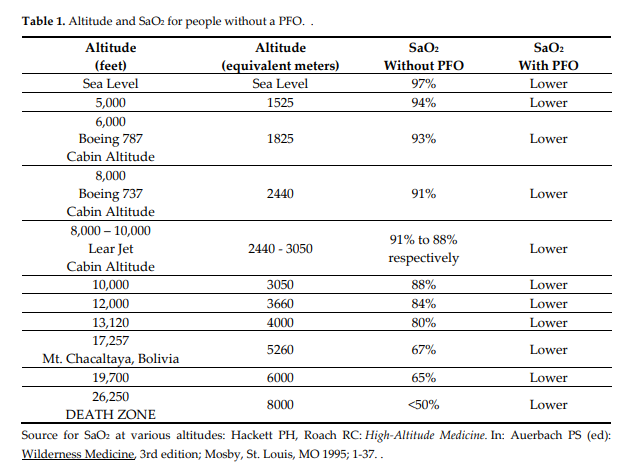 People with a PFO traveling in a Learjet (cabin altitude 8,000-10,000 feet), Boeing 737 (cabin altitude 8,000 feet), or a Boeing 787 (cabin altitude 6,000 feet), will have an SaO2 lower than 88%-91%, 91%, 93% respectively, and below 95% is considered low.