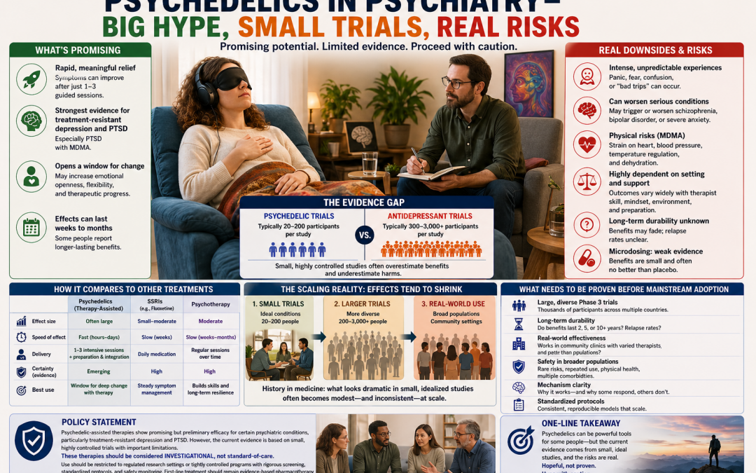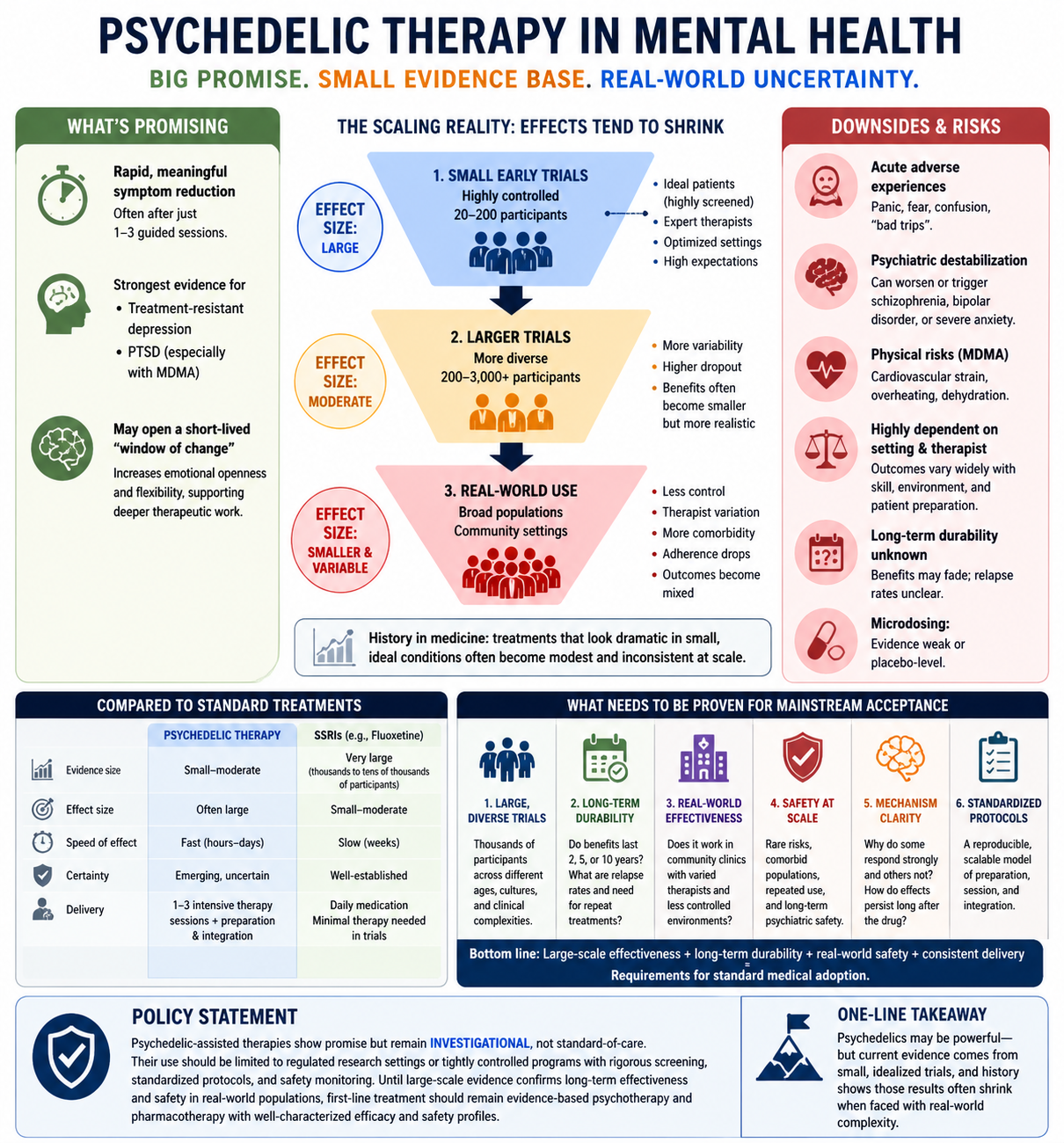 Bottom line: Psychedelic-assisted therapy (e.g., psilocybin, MDMA) shows striking early results—but those results come largely from small, highly controlled studies that tend to overstate benefits and underrepresent real-world risks.
