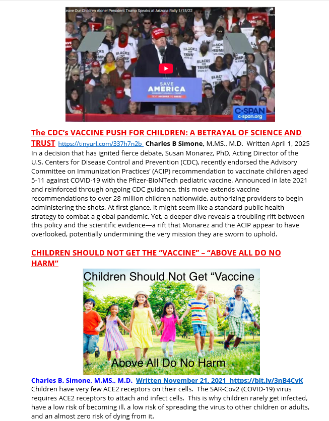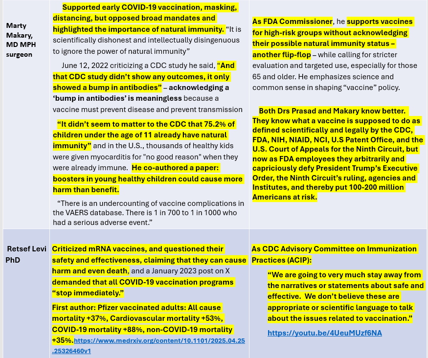 In a dramatic flip-flop, they even call their policy “evidence-based approach to Covid-19 vaccination” rather than adhering to FDA’s mission of evaluating vaccines for efficacy and safety. (An evidence-based approach to Covid-19 vaccination. N Engl J Med 2025;392:2484-6). This defies President Trump’s “transparency and gold standard scientific excellence.”