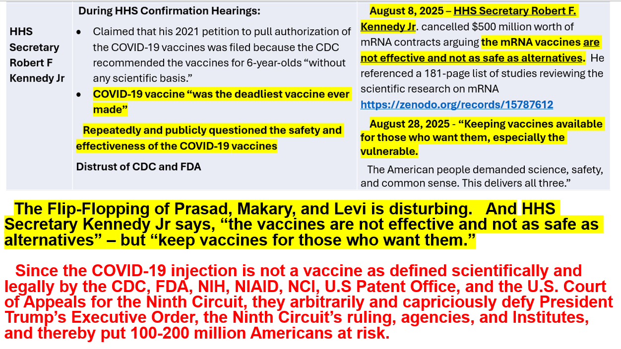 Both Drs Prasad and Makary know better. They know what a vaccine is supposed to do as defined scientifically and legally by the CDC, FDA, NIH, NIAID, NCI, U.S Patent Office, and the U.S. Court of Appeals for the Ninth Circuit, but now as FDA employees they FLIP and FLOP thus defying President Trump’s Executive Order and the Ninth Circuit Court’s ruling, and thereby putting 100-200 million Americans at risk.