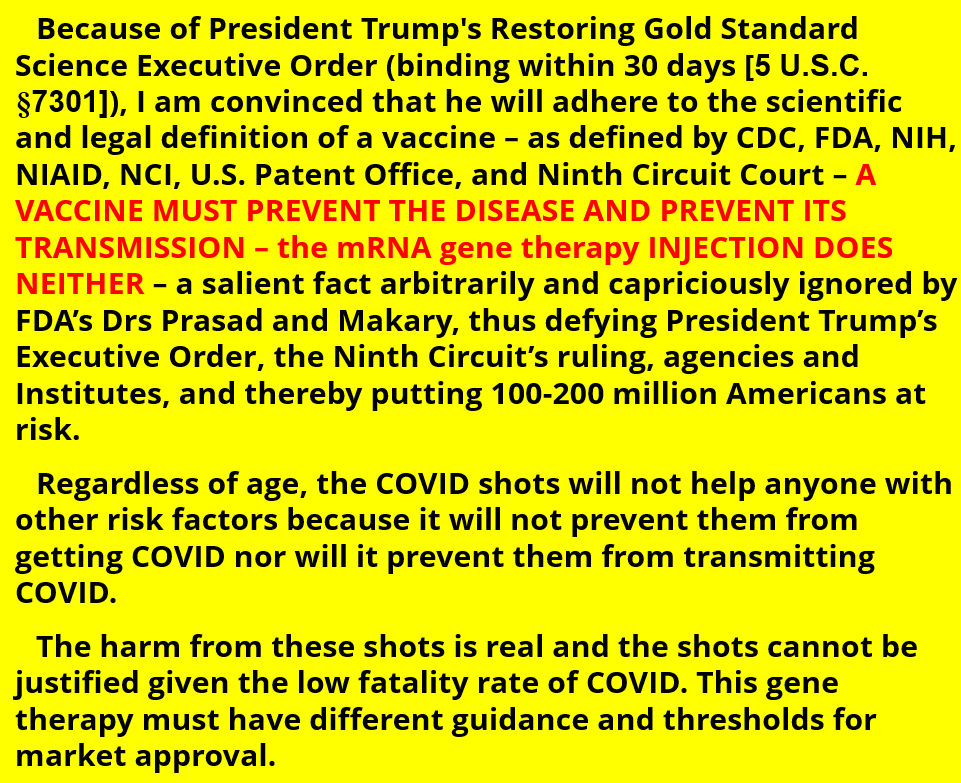 Because of President Trump’s @realDonaldTrump Restoring Gold Standard Science Executive Order (binding within 30 days [5 U.S.C. §7301]), I am convinced that he will adhere to the scientific and legal definition of a vaccine – as defined by the CDC, FDA, NIH, NIAID, NCI, U.S Patent Office, and U.S. Court of Appeals for the Ninth Circuit Court – A VACCINE MUST PREVENT THE DISEASE AND PREVENT ITS TRANSMISSION – the mRNA gene therapy INJECTION DOES NEITHER – a salient fact arbitrarily and capriciously ignored by FDA’s Drs Prasad and Makary thus defying President Trump’s Executive Order, the Ninth Circuit’s ruling, agencies and Institutes, and thereby putting 100-200 million Americans at risk.