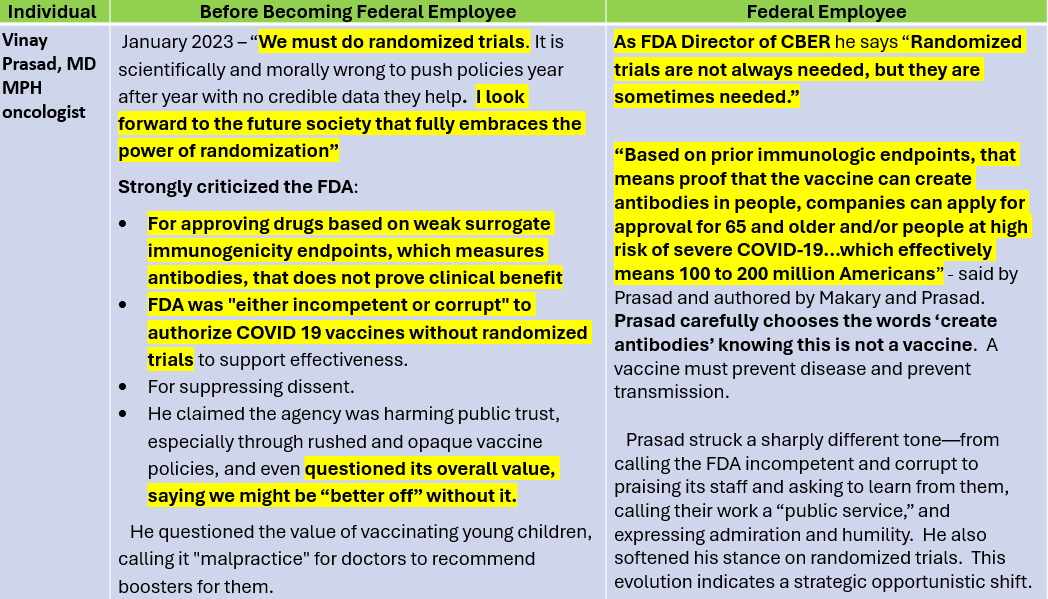 Before Dr Prasad became a Federal employee he said, quote “We must do randomized trials. It is scientifically and morally wrong to push policies year after year with no credible data they help. I look forward to the future society that fully embraces the power of randomization.” Then, as an FDA employee, he said quote “Randomized trials are not always needed, but they are sometimes needed.”
