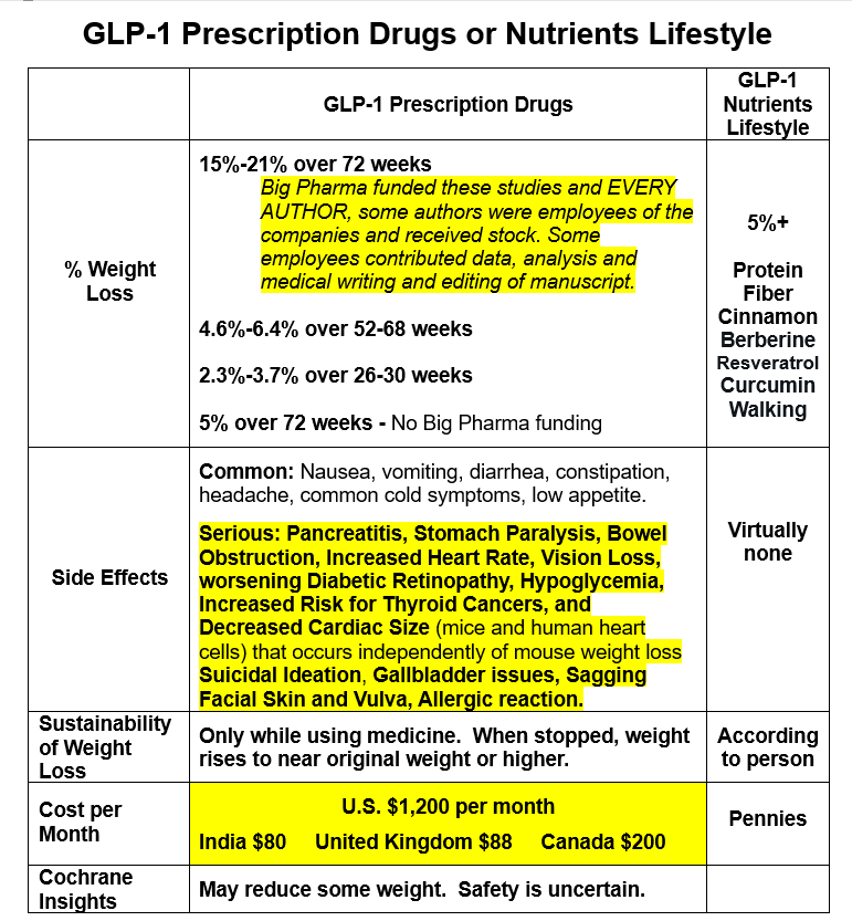 GLP-1 agonists are prescription medications and nutrients used for managing type 2 diabetes and aiding in weight loss. Natural compounds like protein and fiber, and cinnamon, berberine, resveratrol, curcumin together with regular walking contribute to weight loss by naturally enhancing GLP-1 levels, supporting metabolic health and aiding in diabetes and weight management in the absence of significant adverse events and are accessible without prescription. The prescription medications can lead to weight reductions but Big Pharma funded the studies and EVERY AUTHOR, some of whom were employees, and some employees contributed to data preparation and analysis and medical writing and editing assistance of the manuscript. Also, these medications come with a higher cost and side effects.