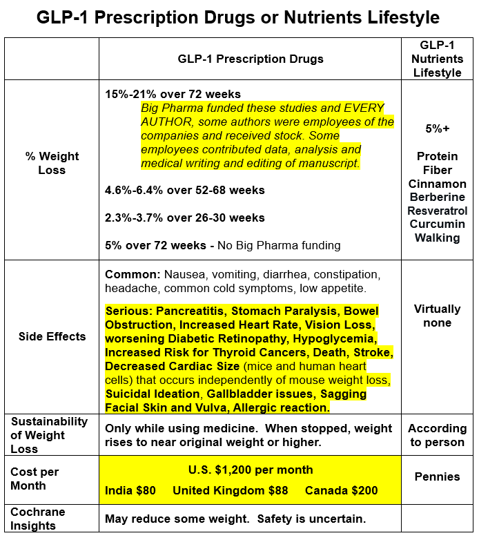 GLP-1 agonists are prescription medications and nutrients used for managing type 2 diabetes and aiding in weight loss. Natural compounds like protein and fiber, and cinnamon, berberine, resveratrol, curcumin together with regular walking contribute to weight loss by naturally enhancing GLP-1 levels, supporting metabolic health and aiding in diabetes and weight management in the absence of significant adverse events and are accessible without prescription. The prescription medications can lead to weight reductions but Big Pharma funded the studies and EVERY AUTHOR, some of whom were employees, and some employees contributed to data preparation and analysis and medical writing and editing assistance of the manuscript. Also, these medications come with a higher cost and side effects.